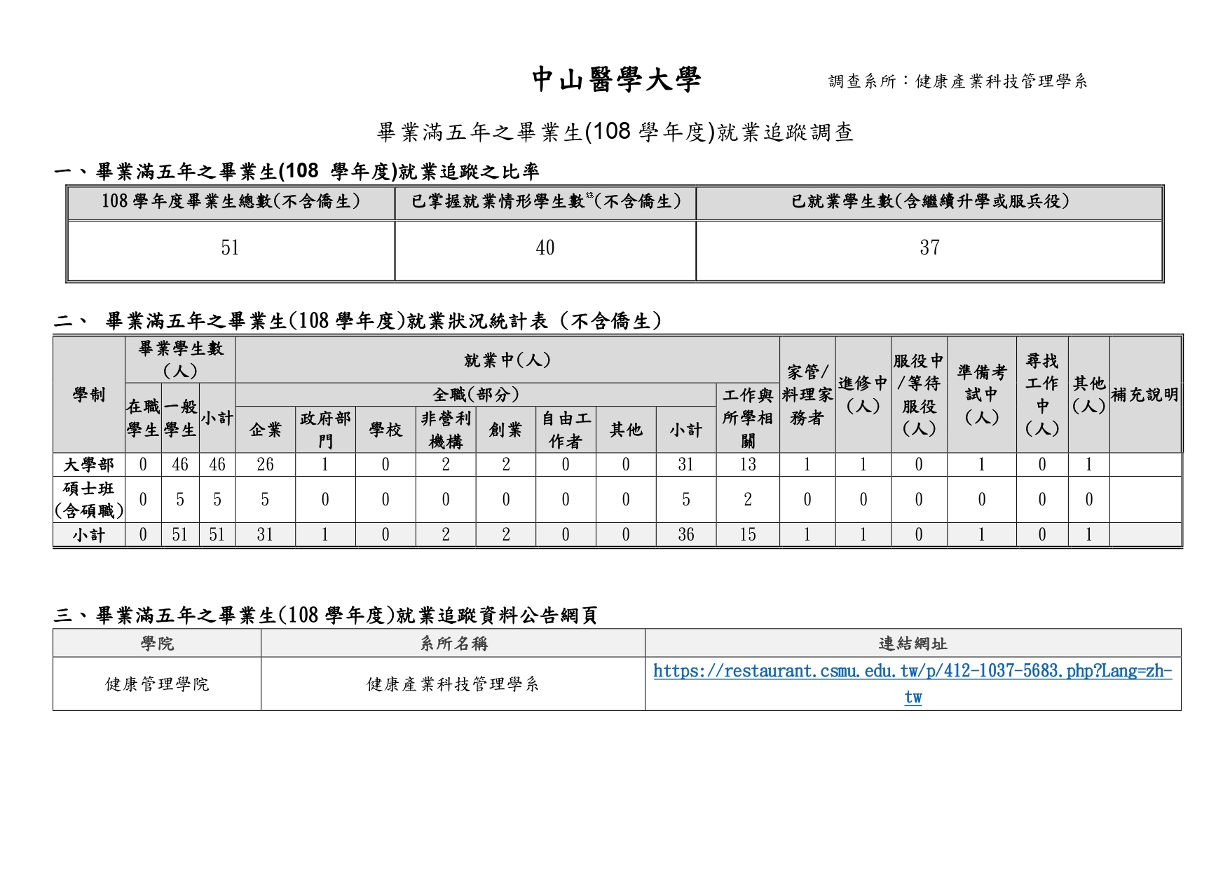 108學年度畢業滿5年學生填答敘述統計表-碩士班